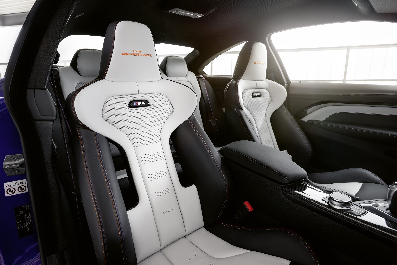 Atraktivní a exkluzivní barevné schéma pokračuje také v interiéru, kde CFRP struktura karbonového obložení, navrženého výhradně pro BMW M4 Edition ///M Heritage, zahrnuje pruh se třemi charakteristickými M barvami. Jak lišty interiéru, tak i prahové lišty nesou loga „Edition ///M Heritage“ a „1/750“ na znamení, že jde o limitovanou edici tohoto modelu. Nápis „///M Heritage“ v tyrkysové, oranžové nebo červené barvě lze najít také na předních opěrkách hlavy.