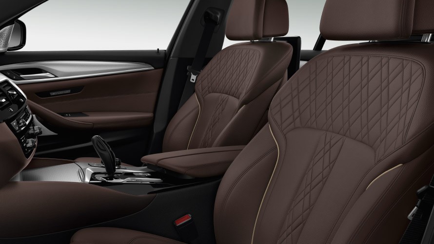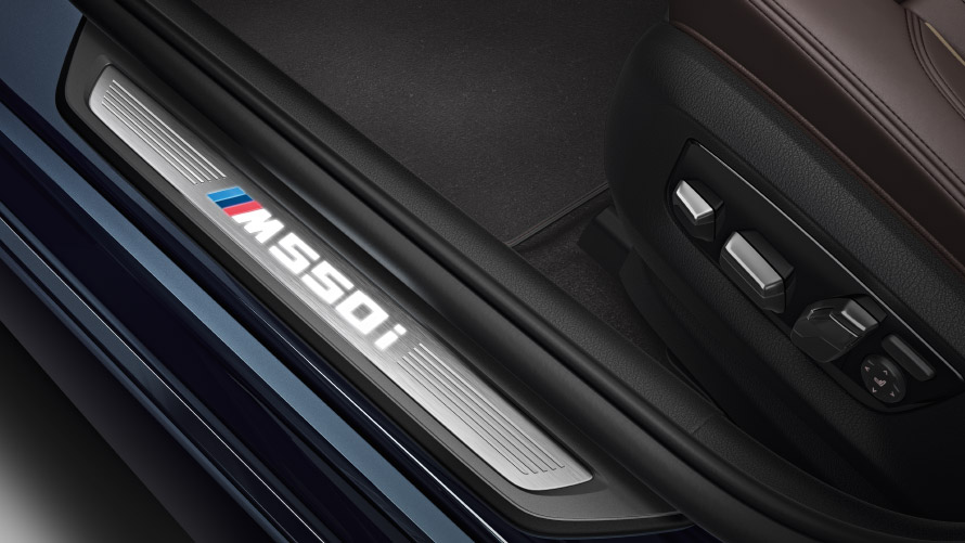 Prahové lišty s označením modelu, specifický přístrojový štít s digitálním označením modelu, M sportovní kožený volant a další detaily z M sportovního paketu: dokonce i interiér BMW M550i xDrive a BMW M550d xDrive vyjadřuje sportovní charakter unikátním způsobem.